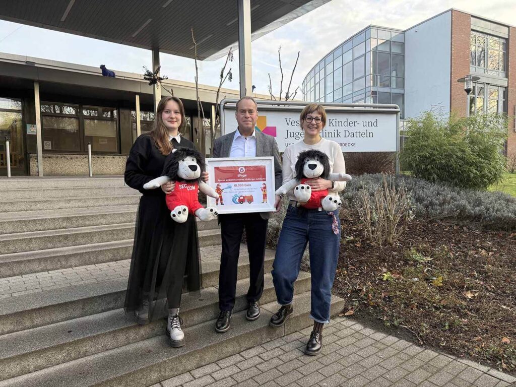 Im Rahmen der Jubiläumsfeier zum 30-jährigen Bestehen hat die SEC-COM GmbH bewusst auf Geschenke verzichtet und stattdessen zu Spenden für ein Herzensprojekt aufgerufen. Partner, Kunden und weitere Unterstützende beteiligten sich an der Spendenaktion zugunsten des Projekts „Blitzfeuerwehr“ der Kinderklinik Datteln.