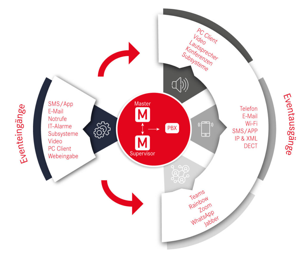 Das System erkennt kritische Situationen automatisch, verarbeitet sie in Echtzeit und leitet die Informationen gezielt an die zuständigen Personen weiter. Sprachnachrichten, Durchsagen oder digitale Benachrichtigungen werden über verschiedene Kommunikationswege, wie Smartphones, Telefone (schnurgebunden oder schnurlos), E-Mail, PC-Clients, Lautsprecher, WhatsApp oder Microsoft Teams, zuverlässig übermittelt.