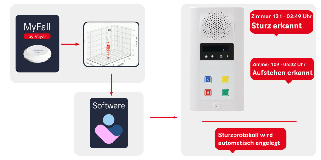 Der Sensor erfasst ungewöhnliche Bewegungsmuster wie plötzlichen Bewegungsstopp oder typische Sturzabläufe und analysiert diese mithilfe intelligenter Technologien. Erkennt das System eine kritische Situation, wird diese an die Software weitergeleitet und automatisch ein Alarm ausgelöst, der mit Zimmer- bzw. Standortangabe direkt an das Pflegepersonal übermittelt wird. Gleichzeitig dokumentiert das System das Ereignis vollständig im Hintergrund.
